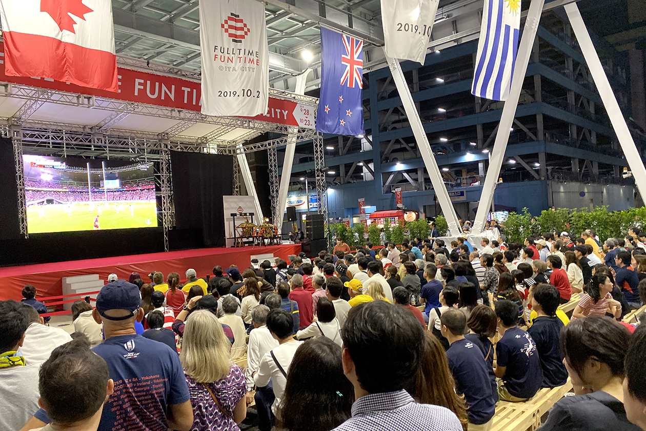確かにMAX5,000人の入場者があったパブリックビューイング開催時の光景は壮観そのものだった。始めは観客席の大型モニターでのパブリックビューイングのみであったが、市の担当部所は来場者のニーズを素早く察知し、一般の飲食ブースにモニターを数台増設、しっかり来場者の心を掴んだ。場内での外国人観光客と日本人が、ラインアウトのリフトアップで戯れたりの交流の姿は眺めるだけでも幸せな気分になった。シャイで人見知りと言われた県民性はどこへいったの? それこそモールやラックに自ら突っ込んでいくような積極的交流姿勢には、県民性そのものが変わったのかと目を疑うほどだった。 街の飲食店や商店街も当初は客の流れに戸惑っていたところが多かったものの、ディスプレイを設置したり期間中にあの手この手でいろんな工夫や発信をするようになり、日を追うに連れて街中への賑わいも拡がりを見せた。