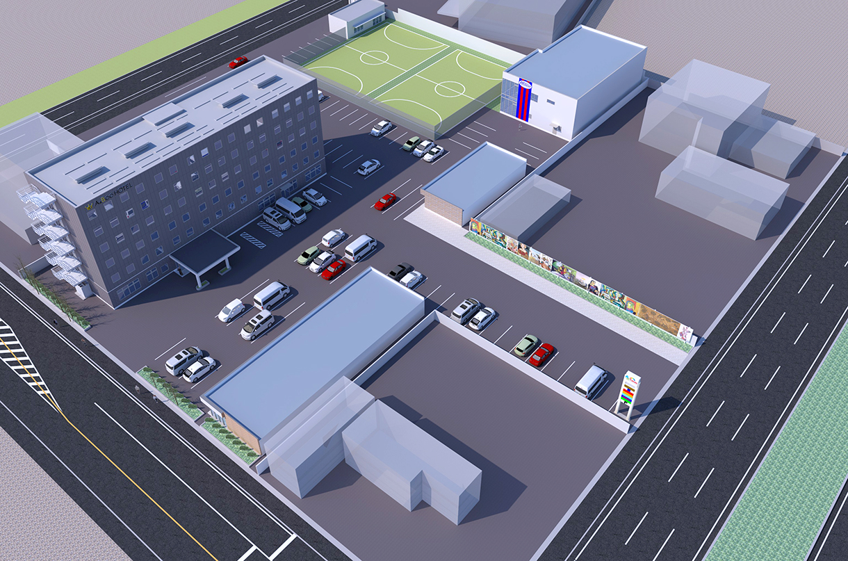 阿部 まず株式会社ABタウンが運営する「A&Beeホテル」は、地上6階建・客室数147室のビジネスホテルで、貸会議室や居酒屋などもご利用いただけるようになっています。さらにコーヒーショップ、ラーメン店、スイーツショップ、フットサルコート、そして周辺住民の皆さんにもご利用いただける託児所をオープンいたします。これらに加え、私と親交がある現代美術家の鎌谷徹太郎さんの作品を展示する「青空美術館」も設置します。ABタウン全体を彼の作品で取り囲み、敷地内を散策しながら鑑賞できるように展示して、作品も順次入れ替えていきます。ABタウンの向いには大手家具チェーンのニトリも同時期にオープンしますし、従来のイメージとはガラリと変わったエリアになるでしょう。