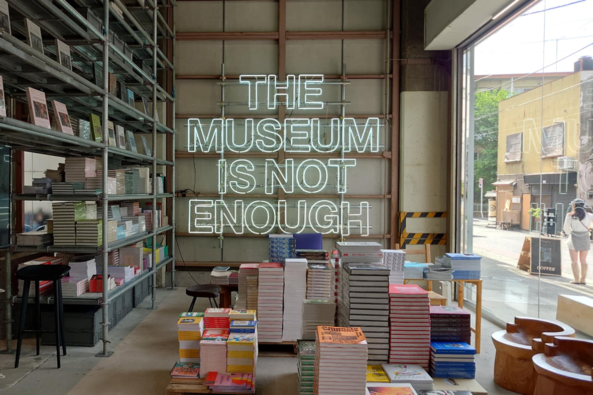 壁一面の「THE MUSEUM IS NOT ENOUGH」という電飾サインの圧が強烈な洋書専門店「twelvebooks」 、廃材が一見乱雑に積み上げられて「THE TOILET TOKYO PARIS」と書かれたトイレ案内の電飾サインもSNS映えすること間違いなし。「SUN」「MOON」「COSMIC」「LOVE」等ユニークなジャンル分けされたアナログレコード店「VDS」、空っぽの巨大倉庫のような薄暗いカフェ「TAWKS」等、ここは葛飾区亀有であることをすっかり忘れてしまう異空間です。